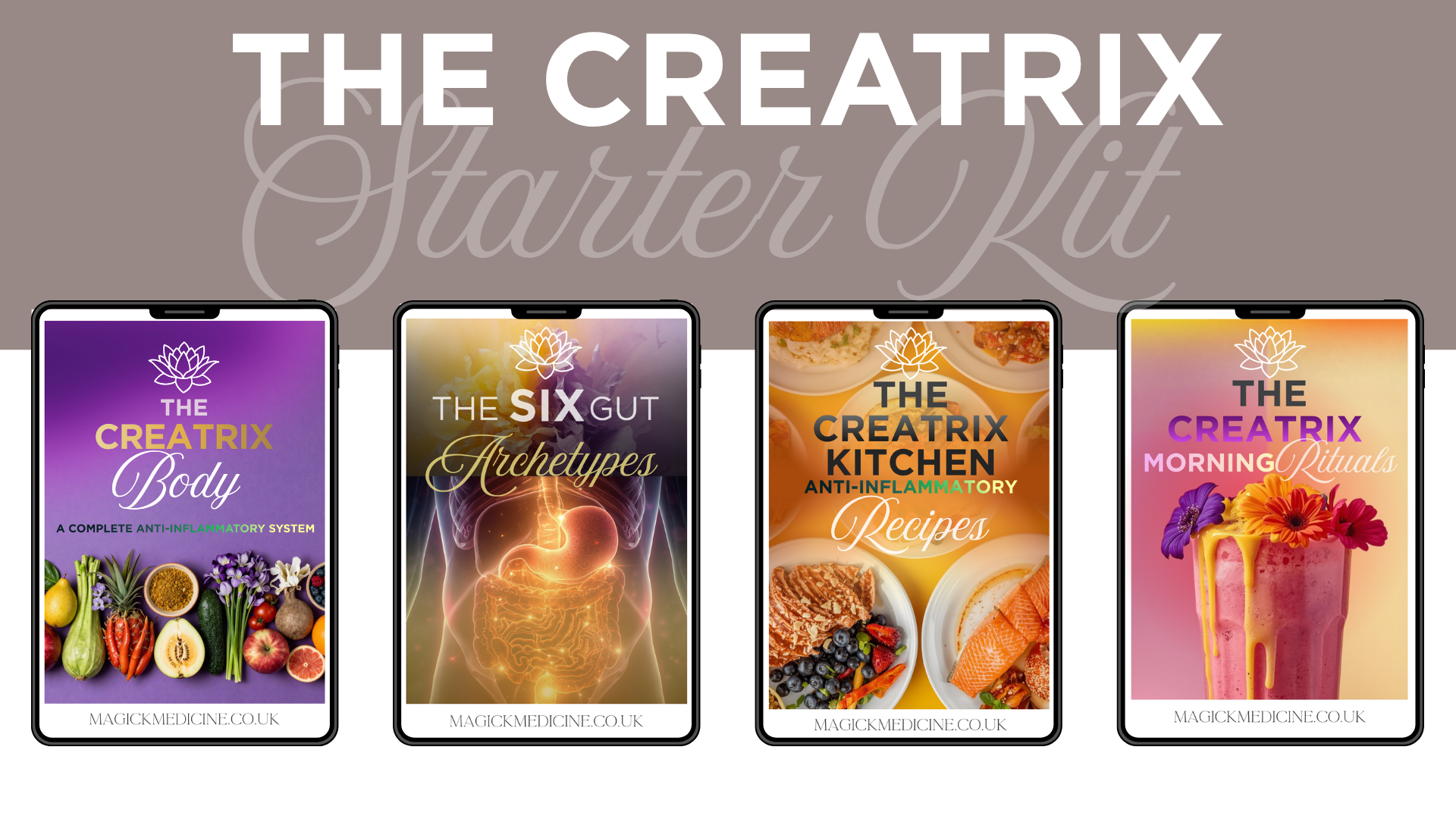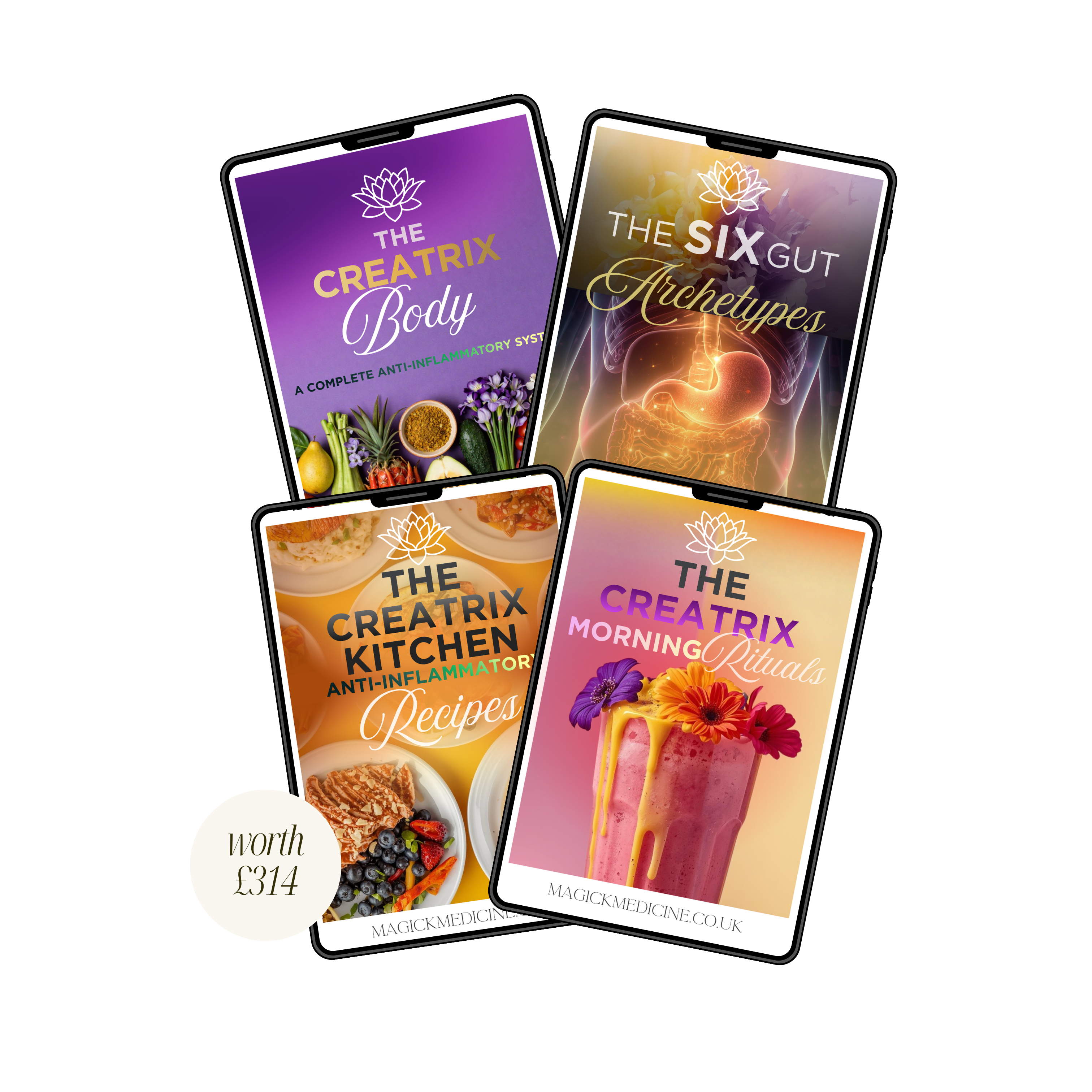 The Creatrix Body. The Six Gut Archetypes Guide. The Creatrix Kitchen. The Creatrix Morning Ritual. Everything you need to decode your gut, personalise your protocols, make every meal medicine and reclaim your mornings - permanently.